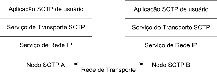 Uma associação SCTP, portanto, corresponde a um serviço que está no mesmo nível de um serviço TCP ou UDP. Essa idéia pode ser vista no diagrama da figura abaixo, onde aparecem a aplicação, o serviço de transporte SCTP (na posição comumente ocupada pelo UDP e pelo TCP) e o serviço IP de transporte.
