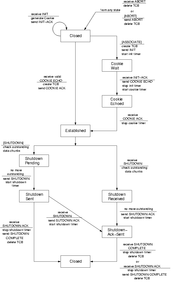 Essa sessão descreve os estados de uma instância do SCTP, desde o estabelecimento de uma associação até seu término. Para estabelecer uma associação os endpoints devem trocar quatro mensagens. O lado passivo (que será chamado de servidor) não aloca recursos até que a terceira dessas mensagens tenha chegado e validada. Esse mecanismo é necessário para garantir que a solicitação da criação de uma associação seja enviada de forma correta (sem a possibilidade de blind spoofing).