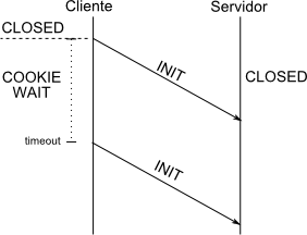 Nesse instante o cliente inicializa um timer, que se expirar sem ter recebido resposta do servidor fará com que o cliente reenvie o chunk INIT. Caso o cliente não tenha recebido uma resposta após um número configurável de tentativas, um erro é reportado para o ULP e o endpoint destino (no caso, o servidor) é registrado como não alcançavel.