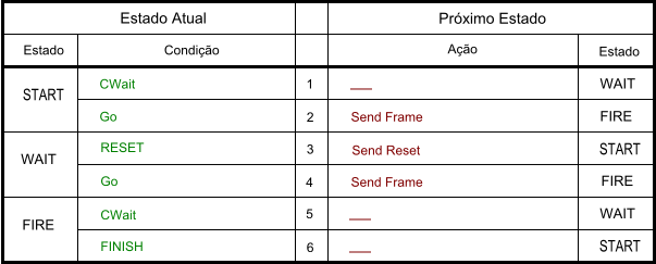 Para completar a descrição da máquina de estados, pode-se acrescentar ao final da mesma uma série de descrições textuais onde as várias condições e ações serão comentadas. A numeração que aparece em cada linha da tabela serve para facilitar a referência no texto às condições e ações que formam a máquina de estados.