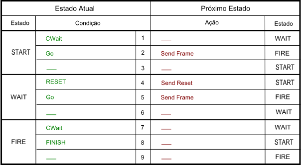 Nessa representação, caso nenhuma das condições seja verdadeira, a máquina de estados permanece no estado atual. Essa condição (se não houver nenhuma condição que seja verdadeira) é chamada de condição padrão (default) e é considerada verdadeira sempre que todas as outras são falsas. Se fosse necessário apresentar, explicitamente, as condições padrões, a Tabela 2 deveria ser alterada para a forma apresentada na Tabela 2. Note o símbolo "—" que aparece na última condição da lista de condições de cada estado.