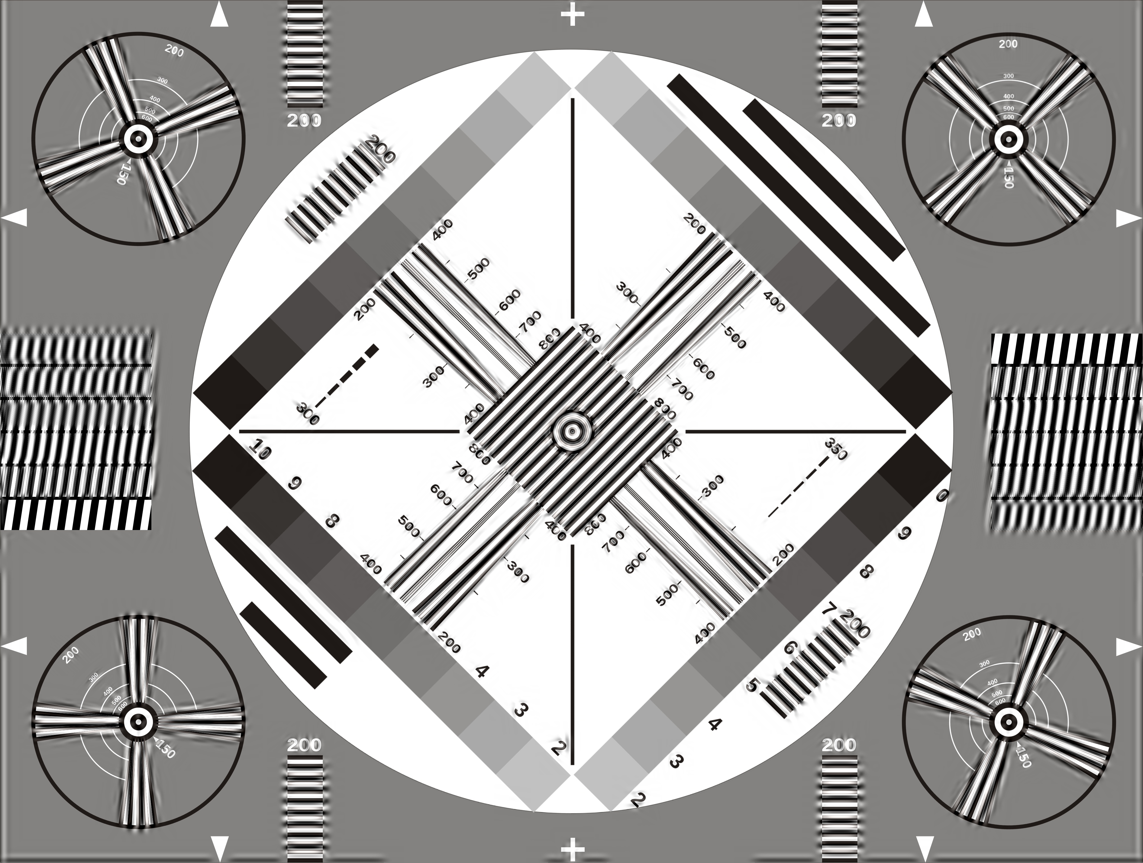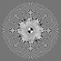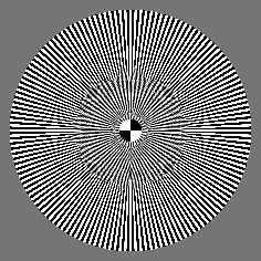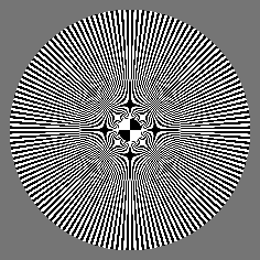 Synthetic circular test patterns with spatial frequency increasing towards the center present a challenge for all downscaling algorithms. This is illustrated in the starchart figure. For this example, the original image on the left was reduced from 4,725 x 4,725 to 236 x 236 pixels (R=20 and \sigma=20). Previous approaches either discard high-frequency information (D(s) and W(s)), and/or introduce aliasing artifacts (O(s) and K(s)). Our wave alignment, as described in Section 4.3 of our paper, also fails in this case due to the impossibility of properly aligning such a circular wave of constant remapped frequency 0.4/R. However, by manually introducing a cut in the graph topology illustrated in Figure 5 of our paper, our wave alignment system returns a solution that retains the convergence of the stripes at the cost of a visual discontinuity, as shown by the results in the starchartcut example. Neither our spectral-remapping nor existing approaches produce optimal results for this challenging example.