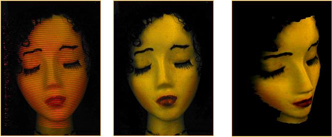 Our second prototype (shown on the left) is comprised of three main hardware components: a digital camera (Olympus C-2020 Zoom), a laser pattern (raster) generator and an interface between the digital camera and the raster generator. Some image processing software is used to reconstruct shapes from the acquired images. The raster generator and the interface are attached to the camera using the tripod screw hole and a bolt/nut combination, which provides a rigid and consistent mounting. Conceptually, the system works as follows: the raster generator projects a set of laser planes in the scene, each at a different elevation angle. The camera acquires a pair of pictures with a single press of the camera’s trigger. One of the pictures contains a set of projected laser lines (created by the rastergenerator) and is used to reconstruct the object’s imaged geometry using triangulation. The other picture is used as texture. Below, you see a pair of pictures acquired by the 3D camera (left and center) and the reconstructed 3D model for the face (shown on the right).