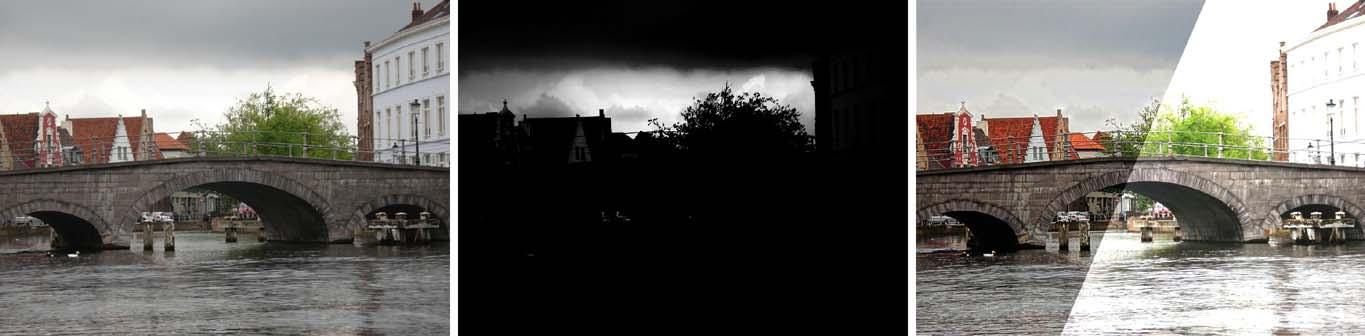| Example of reverse tone mapping using our technique for computing brightness enhancement functions. (left) Input LDR image. (center) Brightness enhancement function produced by our technique. Note that even the boundaries of the tiniest structures have been preserved. Also note the various shades associated to the layers of clouds. (right) Split rendition of the resulting HDR image (white point scaled to 4,800 cd/m2 ). Its darker (left) portion was processed using Reinhard et al.’s [18] photographic local tone mapping operator. The brighter portion was visualized using the HDRShop software (with minus 8 stops). |