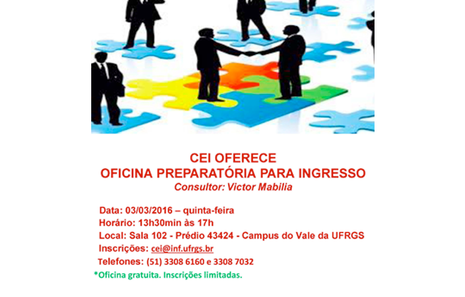 No dia 03 de março, quinta-feira, o Centro de Empreendimentos em Informática da UFRGS – CEI realizará a Oficina Preparatória para Ingresso, que será ministrada pelo Consultor Victor Mabilia, engenheiro com especialização em Gestão Empresarial e com experiência em startups. O evento será das 13h30min às 17h, na sala 102 do prédio 43424 no Campus do Vale da UFRGS.