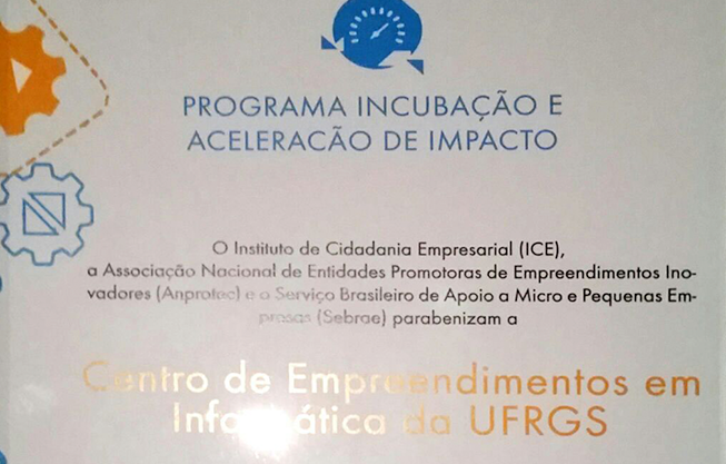 O Centro de Empreendimentos em Informática – CEI-INF/UFRGS foi premiado no Programa Incubação e Aceleração de Impacto, ficando entre os cinco vencedoros do Desafio Incubação e Aceleração de Impacto 2016, organizado pelo Instituto de Cidadania Empresarial – ICE, Associação Nacional de Entidades Promotoras de Empreendimentos Inovadores – ANPROTEC e o Serviço Brasileiro de Apoio a Micro e Pequenas Empresas – SEBRAE.