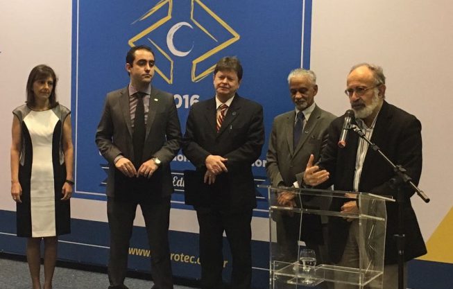 Acompanham a Profa. Ingrid (da direita à esquerda): Prof. Guilherme Ary Plonski (Instituto Christiano Becker), José Silvério (coodenador de Capacitação Tecnológica do Ministério da Ciência, Tecnologia e Inovação), Jorge Mario Campagnolo (coordenador-geral de Serviços Tecnológicos do Ministério da Ciência, Tecnologia e Inovação) e Celio Cabral Sousa Jr. (gerente de Acesso à Inovação e Tecnologia do Sebrae).