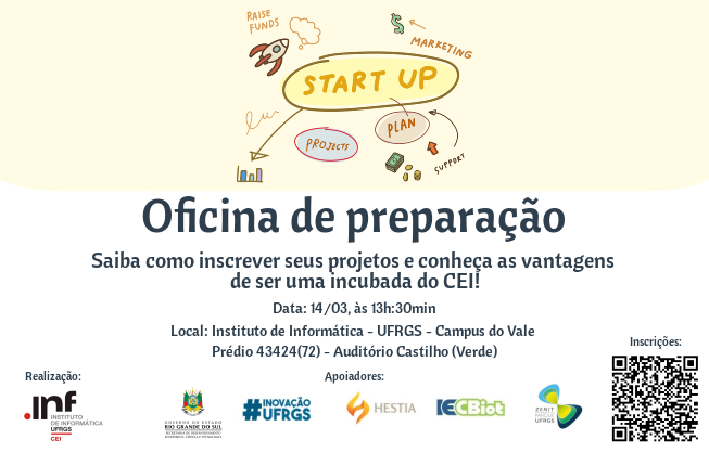 O Centro de Empreendimentos em Informática (CEI), há mais de 20 anos apoia a transformação de ideias empreendedoras em uma oportunidade empresarial concreta. A Oficina de Preparação para o ingresso no CEI é gratuita e destinada a estudantes, startups, empreendedores e demais interessados em desenvolver e investir no seu próprio negócio. A incubadora está focada na área de Tecnologia da Informação e Comunicação (TIC) e proporciona um ambiente fértil para o desenvolvimento sólido de novas empresas.