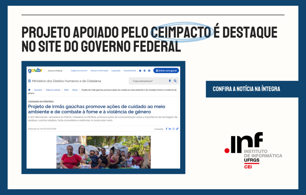 O projeto SDV Reciclando ganhou destaque no portal GOV.Br por suas ações inovadoras voltadas para o meio ambiente e causas sociais. Atendidas pelo programa CEImpacto, iniciativa do Centro de Empreendimentos em Informática (CEI) da Universidade Federal do Rio Grande do Sul (UFRGS), o projeto tem promovido soluções sustentáveis e de impacto social significativo.