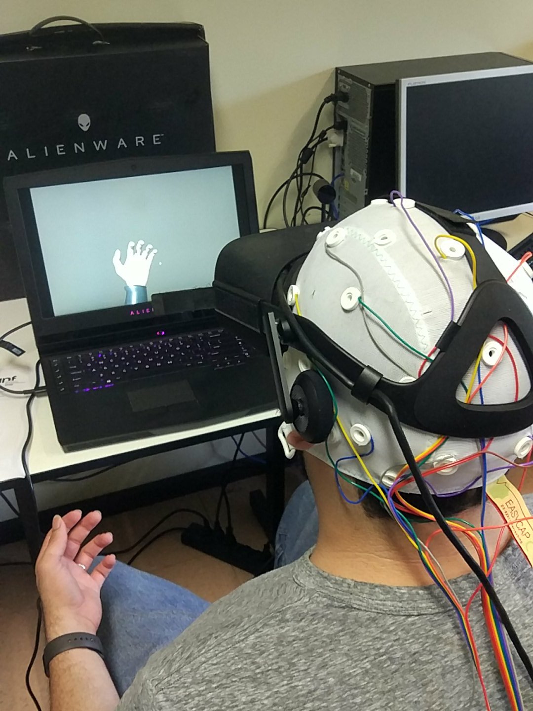 Along of the last decades, the human beings have sought for alternative ways to communicate themselves with machines or systems, in order to overcome difficulties imposed by biological limitations, impairments or just to create a useful wearable. Precisely, Brain-Computer Interface (BCI) employs brain signals (typically, Electroencephalography - EEG) to control or communicate with many systems. This work seeks to explore as much as possible the recently acquired equipment for recording EEG data (OpenBCI) as well as its application in a Virtual Reality (VR) environment. Therefore, a typical BCI methodology is employed for evaluating the device in a motor task using both EEG and Electromyography (EMG) signals in a VR experience where the user can control a virtual arm using either real or imagined movements.