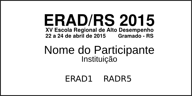 Os certificados digitais dos participantes podem ser obtidos através deste site. Para tal, o participante precisa dos identificadores únicos que foram impressos no seu crachá. Um identificador de certificado é composto por uma combinação de cinco letras e dígitos, em qualquer ordem, onde as letras e dígitos podem ser aquelas que aparecem no nome do evento (ERADRS2015). Veja um exemplo abaixo de um crachá com dois identificadores: