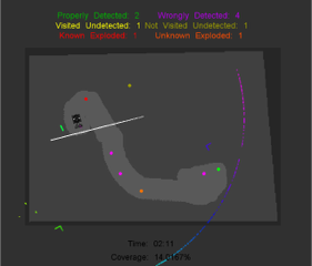After launching the HRATC 2017 framework, the RVIZ window shows up (alongside Gazebo). This window presents the relevant information for the mine detection challenge, such as the properly detected mines, the wrongly detected mines, the exploded mines, the remaining mines, the area covered by the metal detector, the robot path, among others.