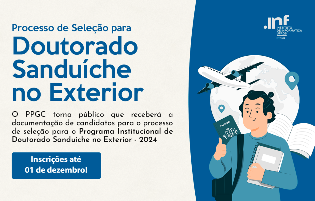 Por meio do Edital PPGC 008/2024, o Programa de Pós-Graduação em Ciência da Computação (PPGC) da UFRGS, em consonância com o Edital 26/2024 da CAPES, torna público que receberá a documentação de candidatos para o processo de seleção para o Programa Institucional de Doutorado Sanduíche no Exterior – 2024. O PPGC indicará até um candidato titular e um candidato suplente, que serão classificados conforme os critérios de avaliação definidos no Edital.