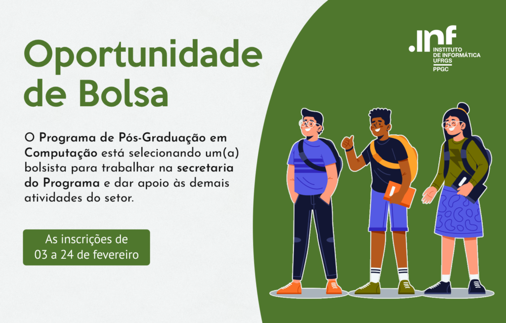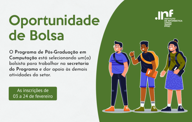 O Programa de Pós-Graduação em Computação (PPGC) anuncia a abertura do processo seletivo para a concessão de uma Bolsa de Desenvolvimento Institucional. A vaga destina-se à atuação na Secretaria do PPGC, auxiliando nas atividades administrativas e operacionais do programa.