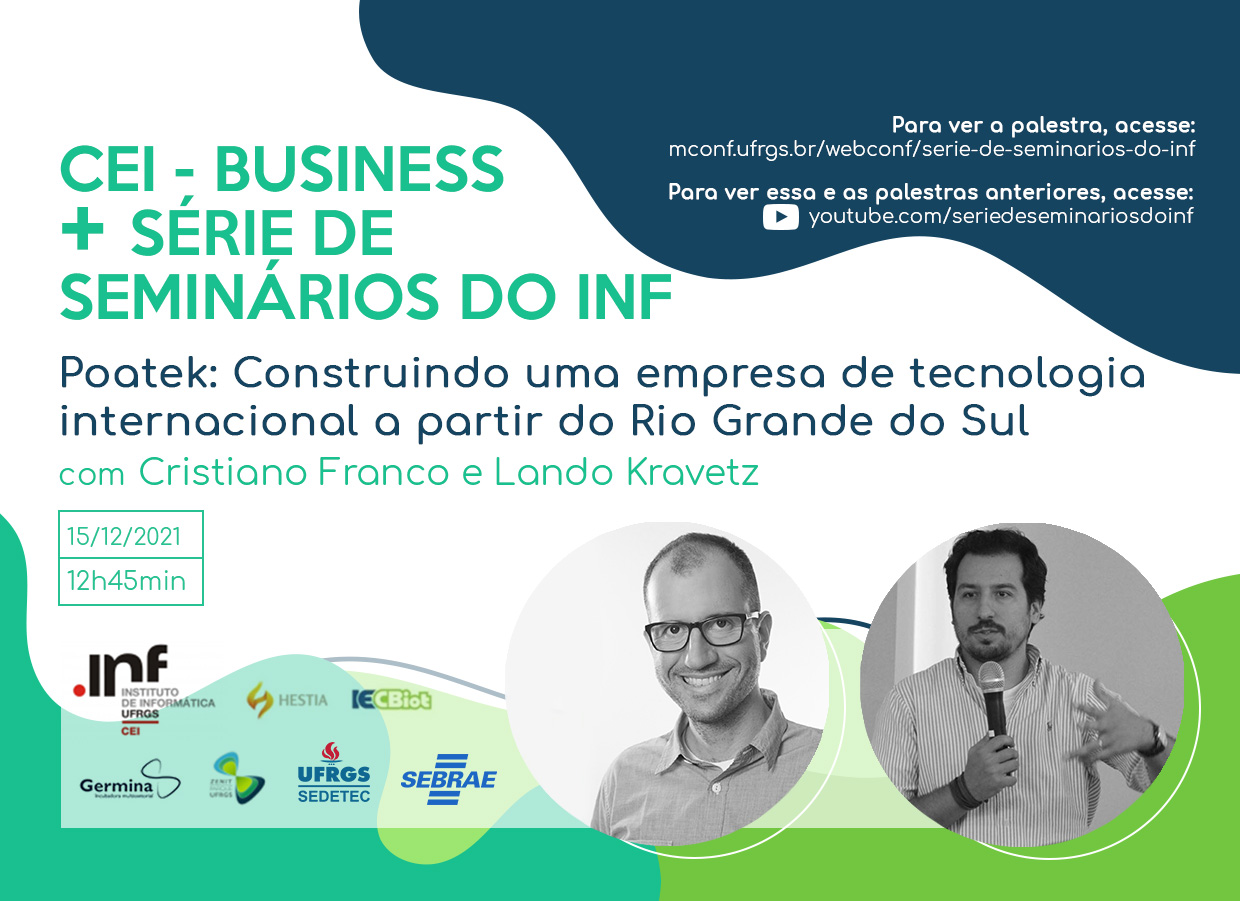 Nesta palestra, Cristiano Franco e Lando Kravetz, fundadores da Poatek, vão nos contar a trajetória desta empresa de tecnologia sediada em Porto Alegre, que hoje em dia conta com 160 profissionais de Computação, desde sua fundação em 2015 até sua recente aquisição por um fundo norte-americano de capital privado, e nos mostrar que é possível criar empresas de tecnologia de classe mundial no Rio Grande do Sul.