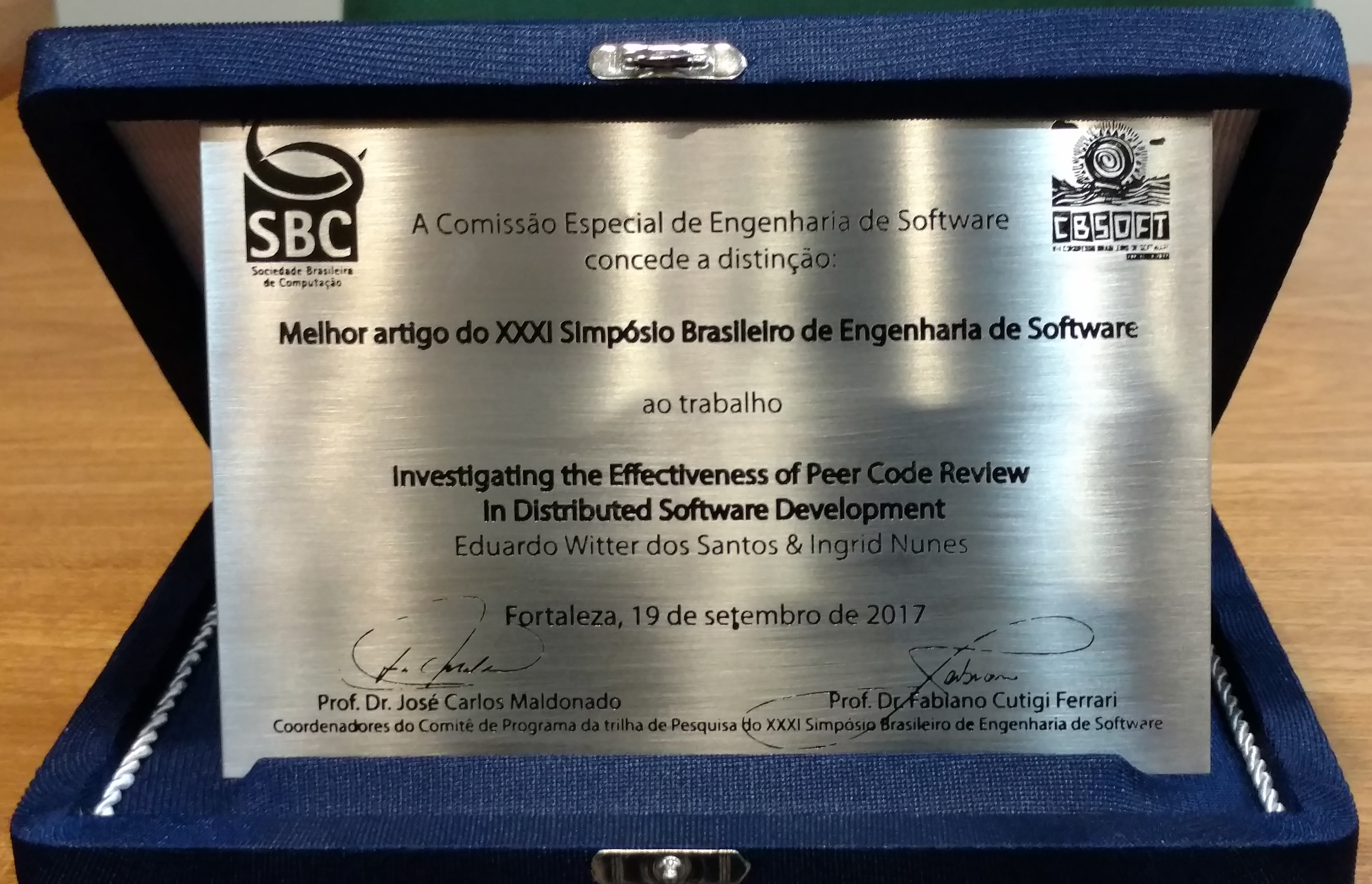 Artigo que ganhou o prêmio de melhor artigo: Investigating the Effectiveness of Peer Code Review in Distributed Software Development, de Eduardo Witter dos Santos (UFRGS) e Ingrid Nunes (UFRGS). Acesso o artigo na íntegra clicando aqui.