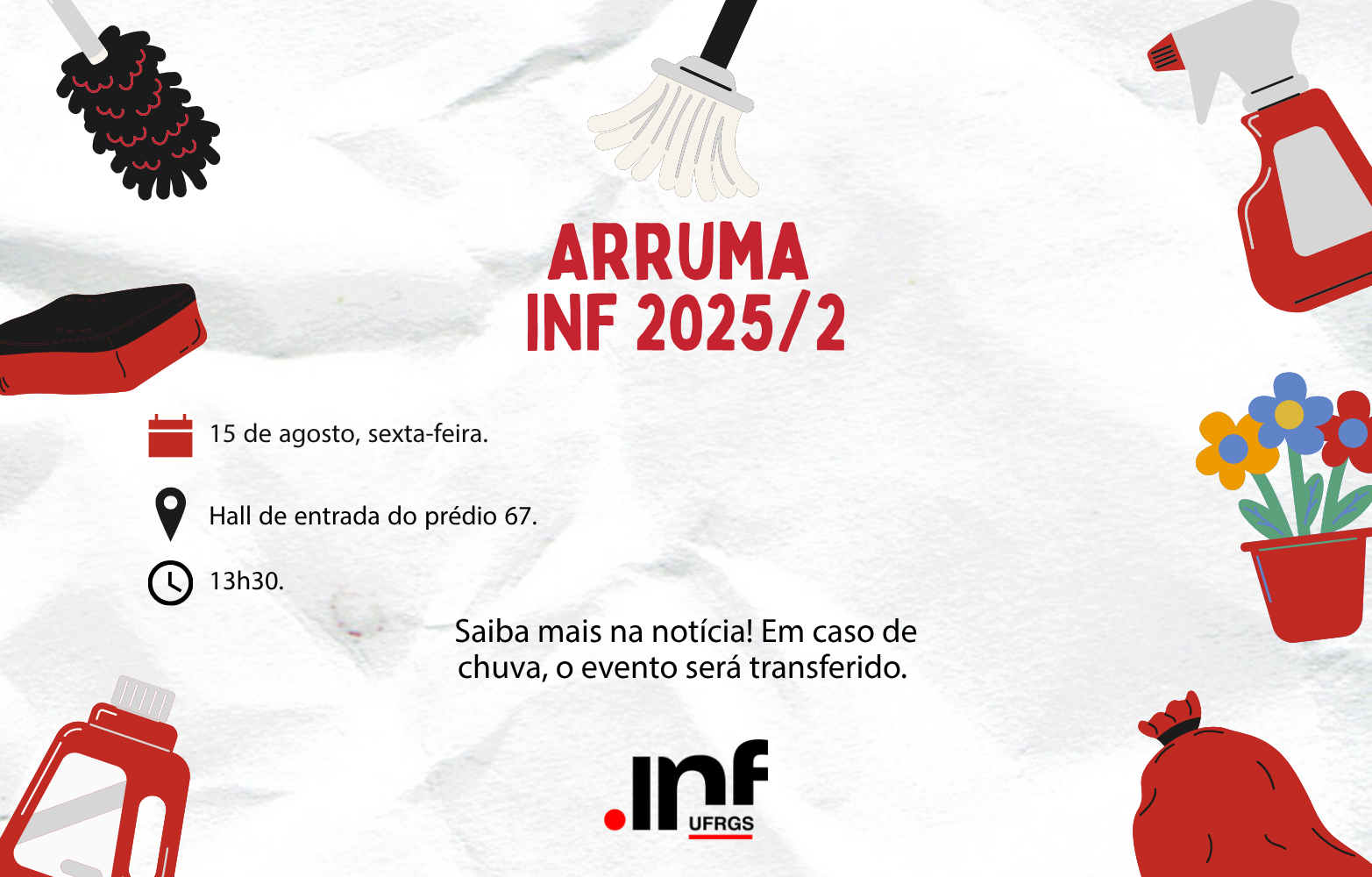 No dia 15 de agosto, sexta-feira, das 13h30 às 16h30, teremos a edição Arruma INF 2025/2!