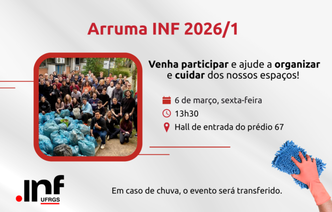 No dia 6 de março (sexta-feira), das 13h30 às 16h30, realizaremos mais uma edição do Arruma INF. O evento tem como objetivo mobilizar a comunidade do Instituto de Informática — alunos, professores, técnicos administrativos e colaboradores — em um grande mutirão para a manutenção e melhoria dos espaços coletivos.