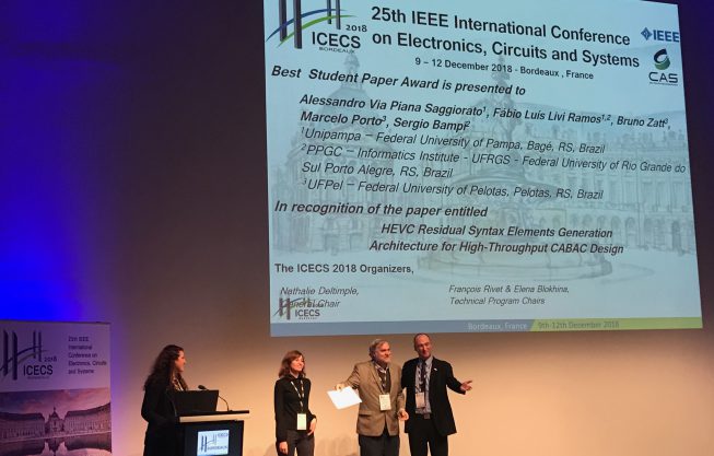 O artigo “HEVC Residual Syntax Elements Generation Architecture for High-Throughput CABAC Design” do doutorando do PPGC Fábio Ramos e do aluno da Unipampa Alessandro Saggiorato, juntamente com os professores Brunei Zatt da UFPel e Sérgio Bampi aqui do Instituto de Informática, recebeu o Best Student Paper Award no ICECS 2018 (25th IEEE International Conference on Electronics, Circuits and Systems).