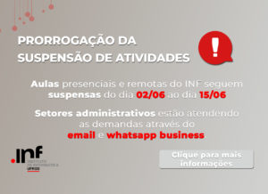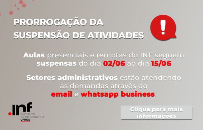 A Universidade Federal do Rio Grande do Sul divulgou uma nova portaria sobre a suspensão de atividades devido aos impactos das enchentes no RS, portaria 3343, que prorroga as atividades acadêmicas e expediente do dia 02/06 ao dia 15/06. Sendo assim, estão suspensas todas as atividades acadêmicas do Instituto de Informática, sejam elas presenciais ou não, bem como o expediente técnico-administrativo.