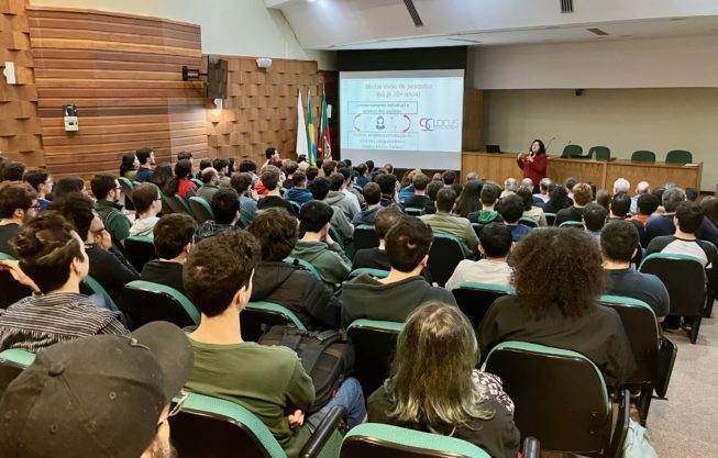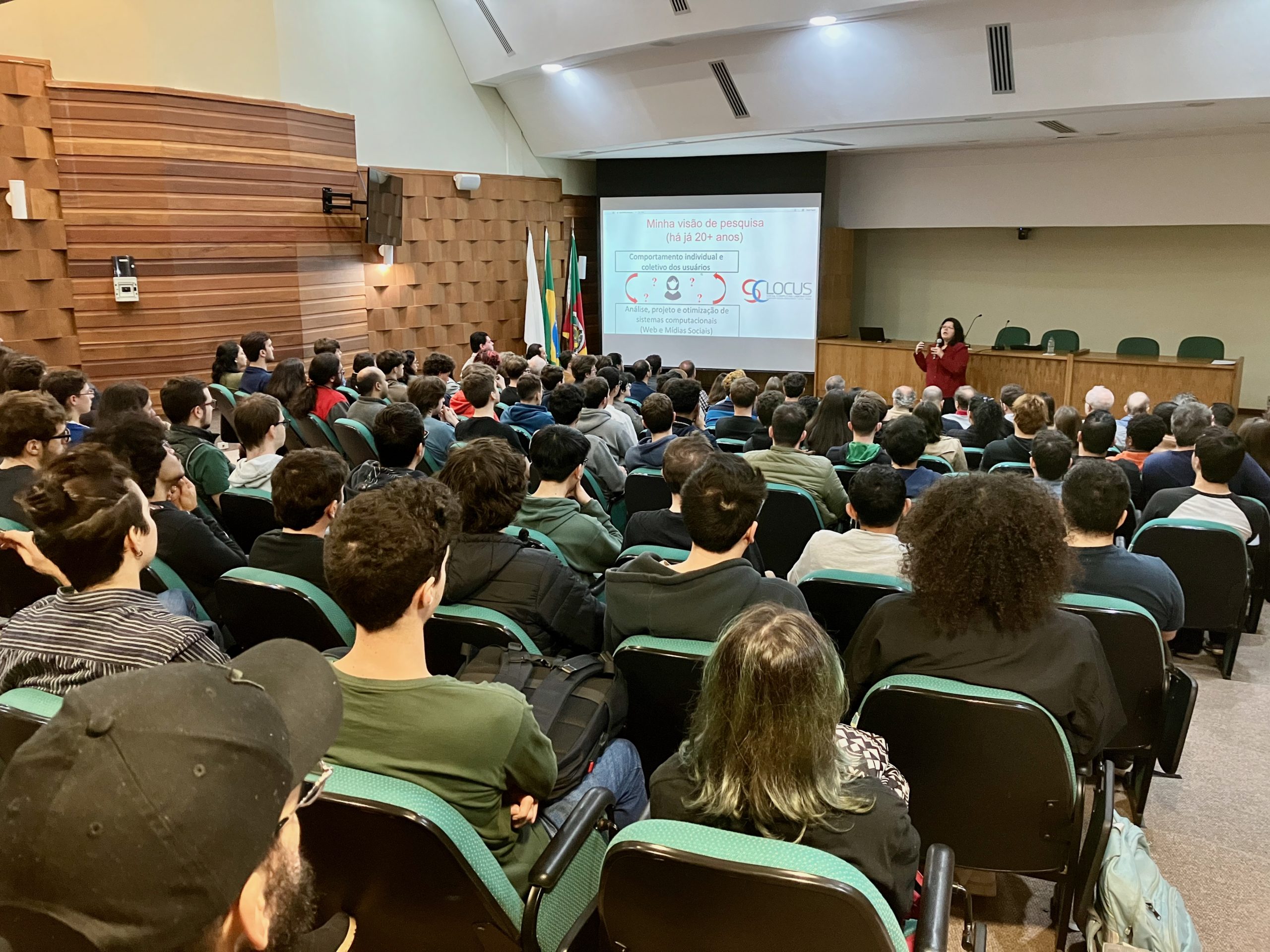 A aula inaugural do semestre de 2025/2, realizada no dia 20/08, com a temática “Mentes Curiosas e Ações Coletivas: Como o Comportamento Humano Impulsiona a Disseminação de Informação Online”, lotou o auditório com alunos, professores e egressos que compareceram para dialogar com a Profa. Jussara Almeida.