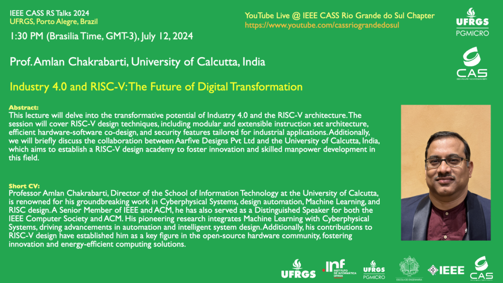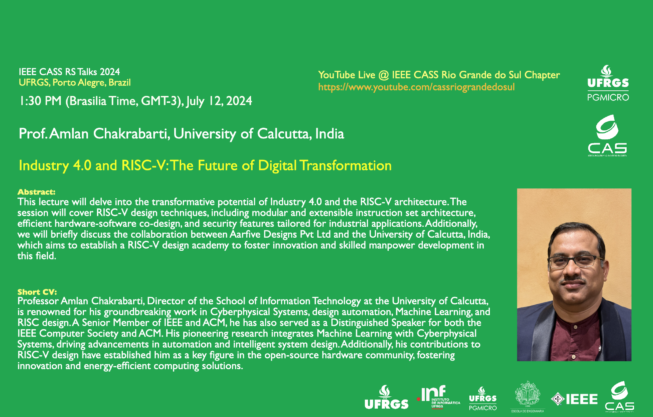 No dia 12 de julho às 13:30h (Horário de Brasília) ocorrerá a palestra “Industry 4.0 and RISC-V: The Future of Digital Transformation” com Prof. Amlan Chakrabarti, University of Calcutta, India