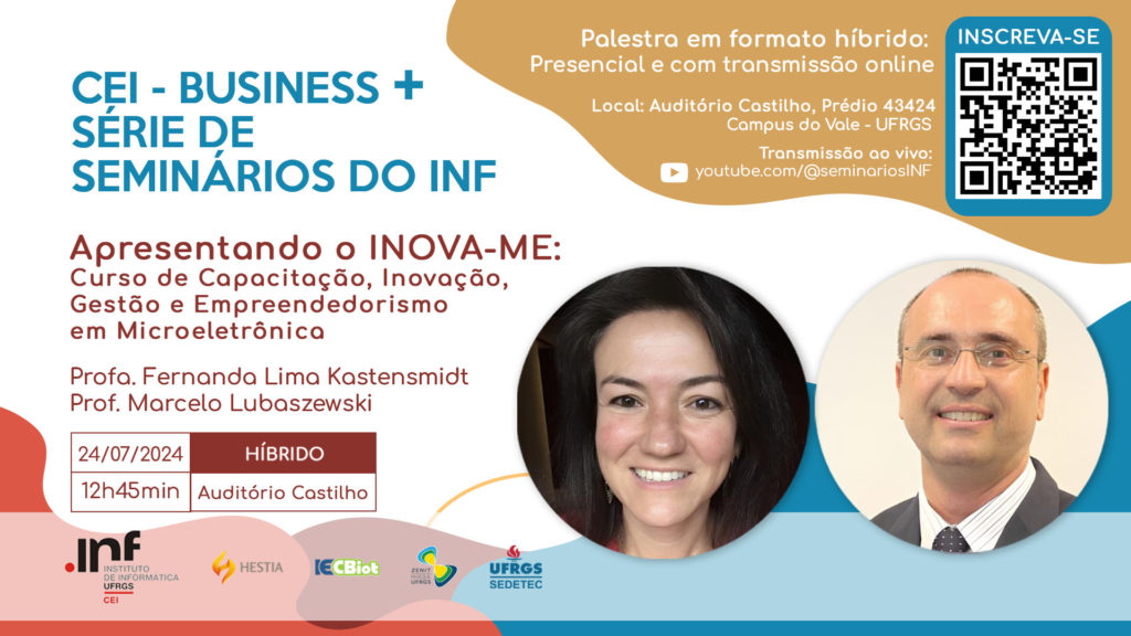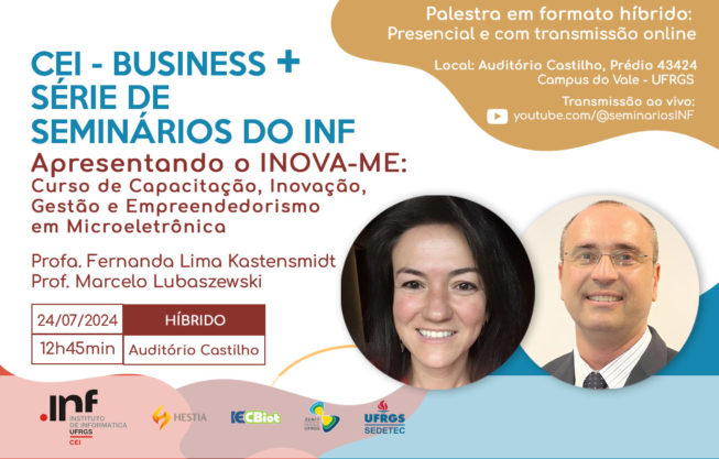 O programa CI-INOVADOR é uma política pública criada pelo Governo Federal e tem como missão contribuir para o avanço do ecossistema de Microeletrônica no país, visando à inovação em produtos e à inserção do país no mercado de semicondutores. INOVA-ME é um dos polos de capacitação do Programa CI-Inovador, financiado pelo MCTI, coordenado pela Softex e executado pelo Instituto de Informática da Universidade Federal do Rio Grande do Sul (INF-UFRGS). Trata-se de um programa de capacitação plena de profissionais, associando aos conhecimentos técnicos da área de semicondutores os conhecimentos das áreas das ciências econômicas, administração, direito e psicologia, essenciais ao exercício profissional na área da Microeletrônica. O programa é composto por três etapas: a fase 1 é voltada à construção e consolidação do conhecimento e tem duração de 6 meses; a fase 2, também com duração de 6 meses, é voltada à experiência profissional num contexto internacional e de projeto de System on Chip (SoC), num exercício de negócios que caracteriza o modelo de operação de “design houses”; e a fase 3 consta de um estágio profissional com duração de 18 meses a realizar-se em uma empresa parceira. O curso conta com mais de 40 professores e profissionais altamente especializados na área de Microeletrônica e profissionais com grande experiência em gestão e empreendedorismo. Mais de 30 empresas e instituições nacionais e internacionais estão engajadas no curso INOVA-ME do INF-UFRGS, que iniciará em 21 de outubro, com palestra inaugural no dia 14 de outubro. Mais informações em: https://www.inf.ufrgs.br/inova-me/