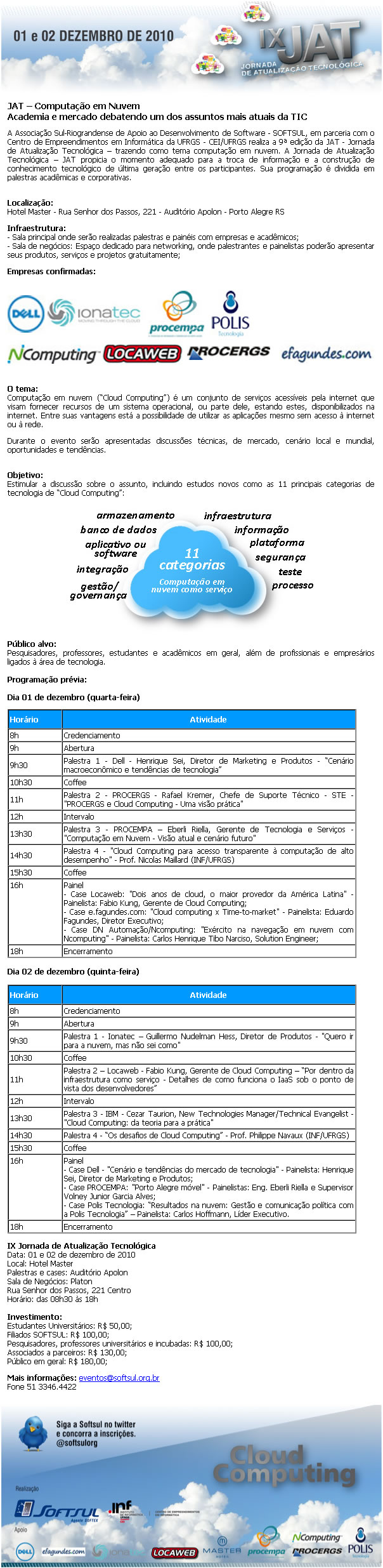 Nos dias 1º e 2 de dezembro de 2010 a SOFTSUL, em parceria com o Centro de Empreendimentos em Informática (CEI), do INF/UFRGS , realiza a 9ª edição da JAT – Jornada de Atualização Tecnológica – trazendo como tema computação em nuvem.