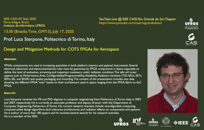 Nesta quarta-feira, dia 10/07 às 13h30min (Horário de Brasília) ocorrerá a palestra “Design and Mitigation Methods for COTS FPGAs for Aerospace”, com o Prof. Luca Sterpone (Politecnico di Torino, Italy). A transmissão será feita pelo canal do YouTube do IEEE CASS Rio Grande do Sul Chapter.