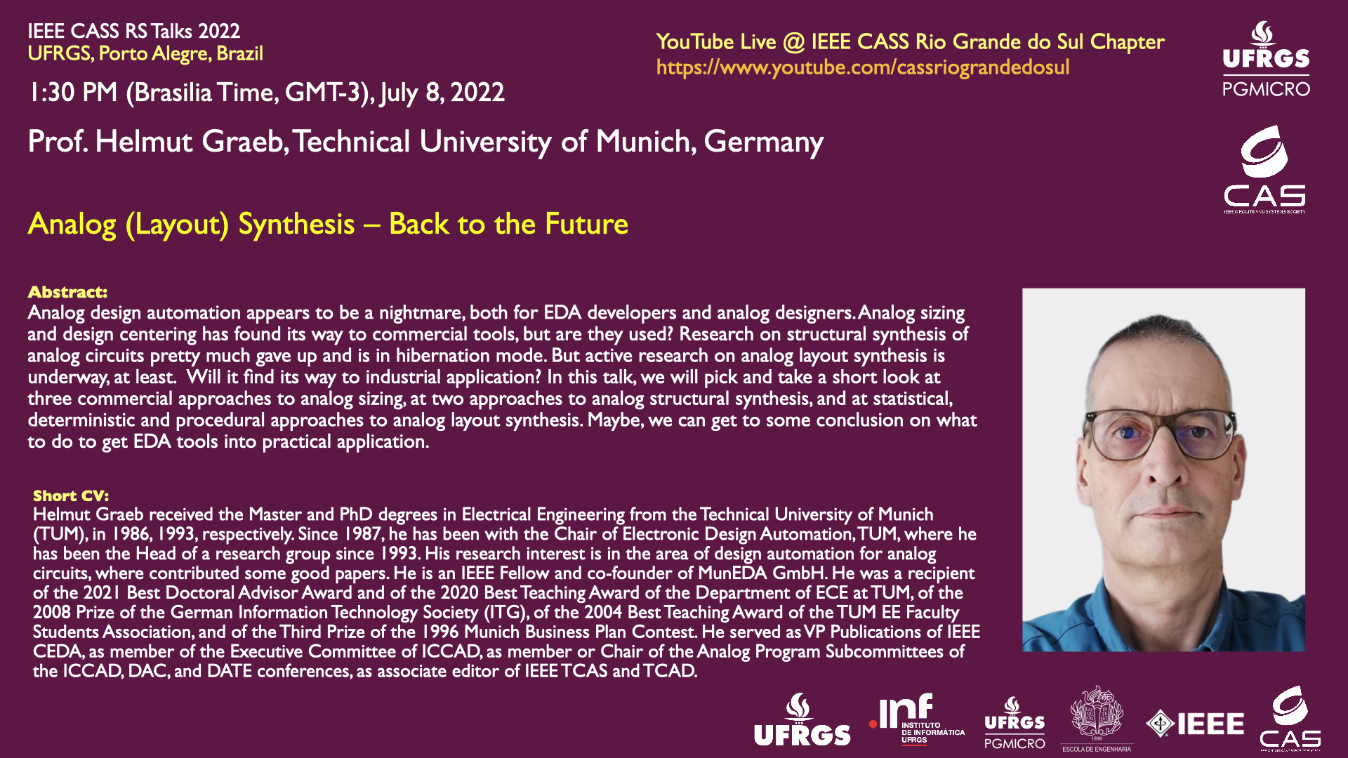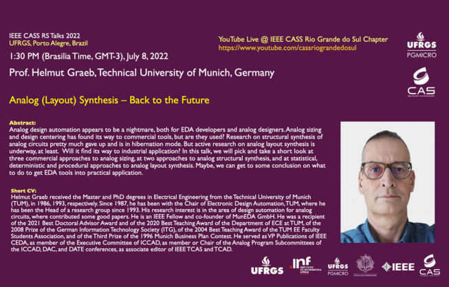 No dia 08/07 às 13h30min (Horário de Brasília) ocorrerá a palestra “Analog (Layout) Synthesis – Back to the Future” com o Prof. Helmut Graeb (Technical University of Munich, Germany).