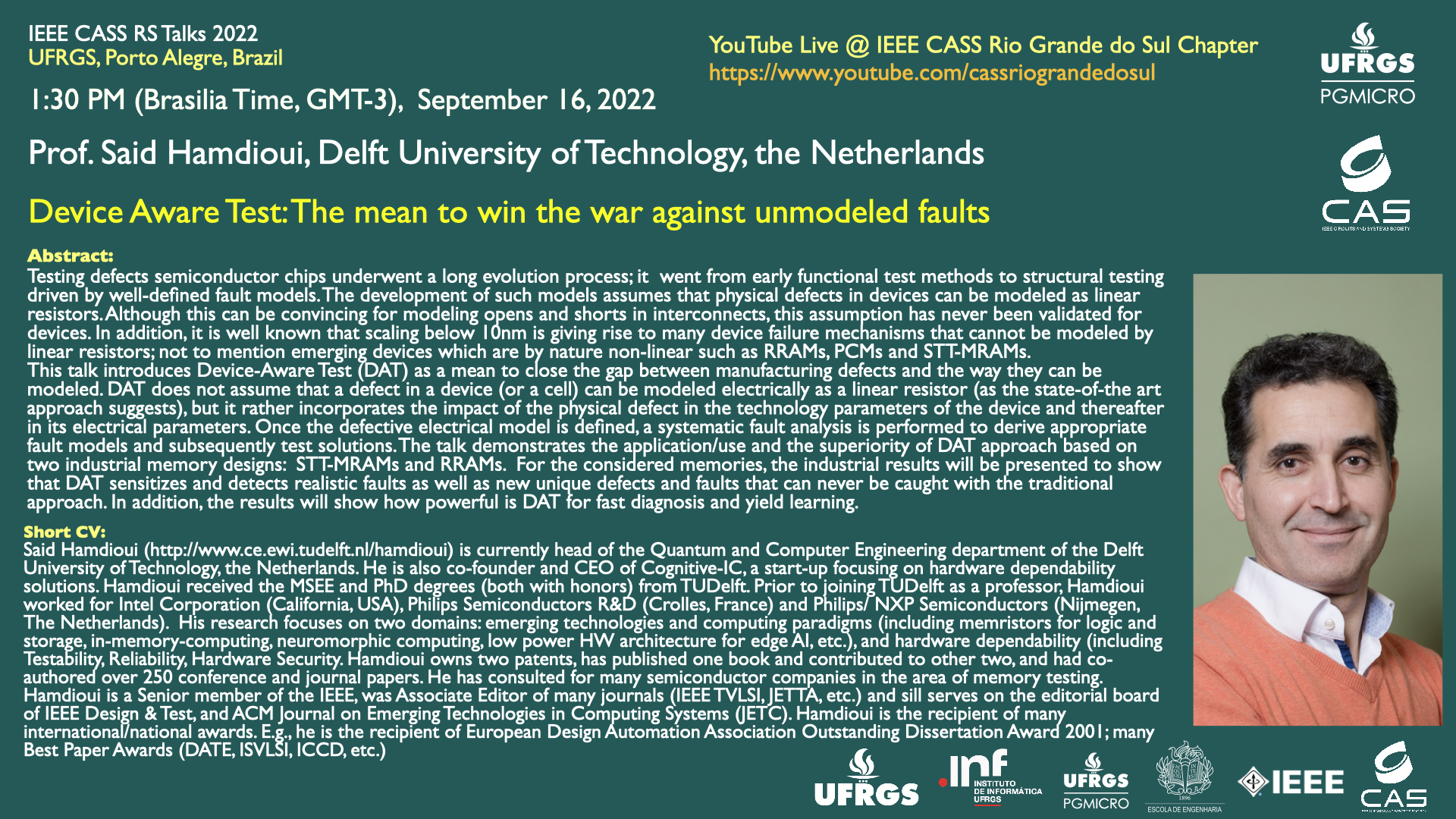 No dia 16/09 às 13h30min (Horário de Brasília) ocorrerá a palestra “Device Aware Test: The mean to win the war against unmodeled faults” com o Prof. Said Hamdioui (Delft University of Technology, the Netherlands).