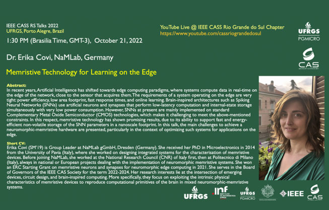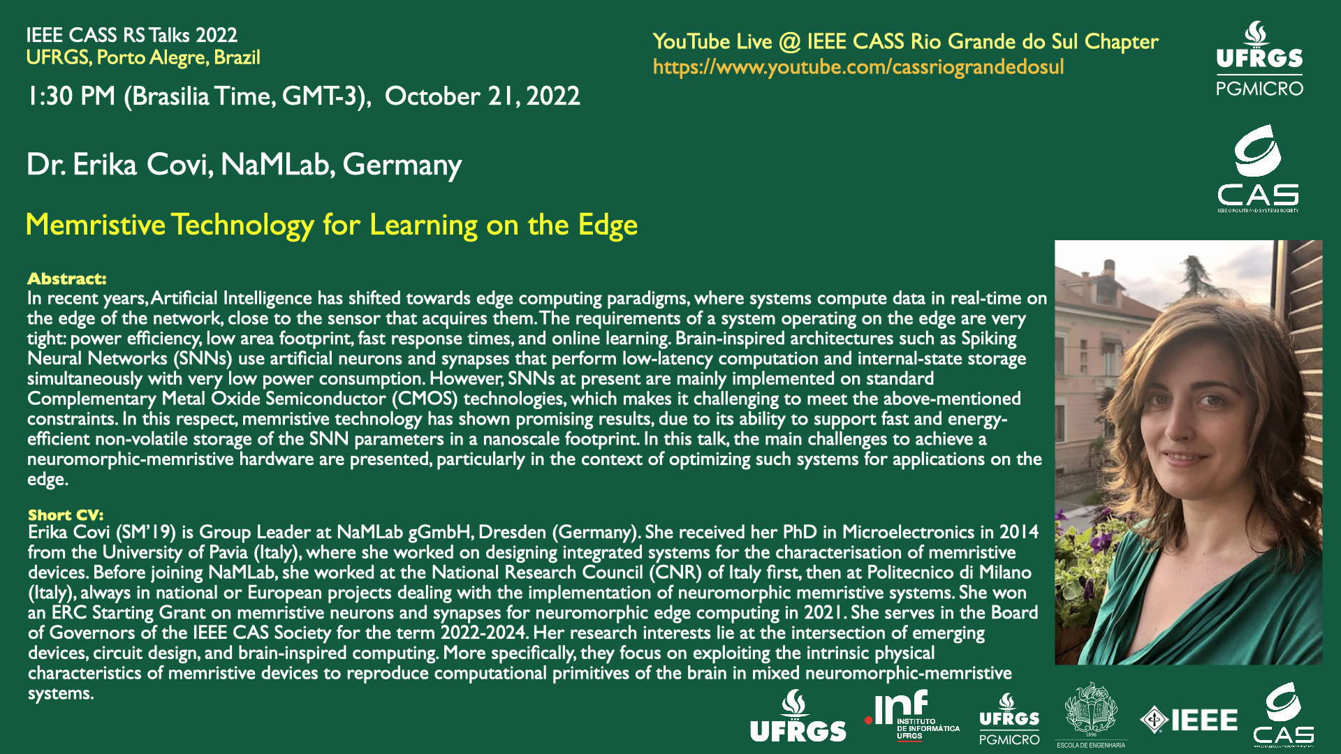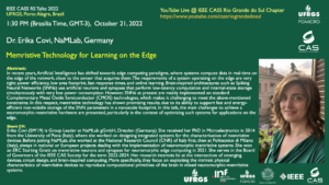 No dia 21/10 às 13h30min (Horário de Brasília) ocorrerá a palestra “Memristive Technology for Learning on the Edge” com a Dra. Erika Covi (NaMLab, Dresden,Germany).