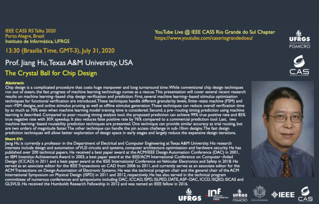 Nesta sexta-feira, dia 31/07 às 13h30min (Horário de Brasília) ocorrerá a palestra “The Crystal Ball for Chip Design”, com o Prof. Jiang Hu (Texas A&M University, USA). A transmissão será feita pelo canal do YouTube do IEEE CASS Rio Grande do Sul Chapter.