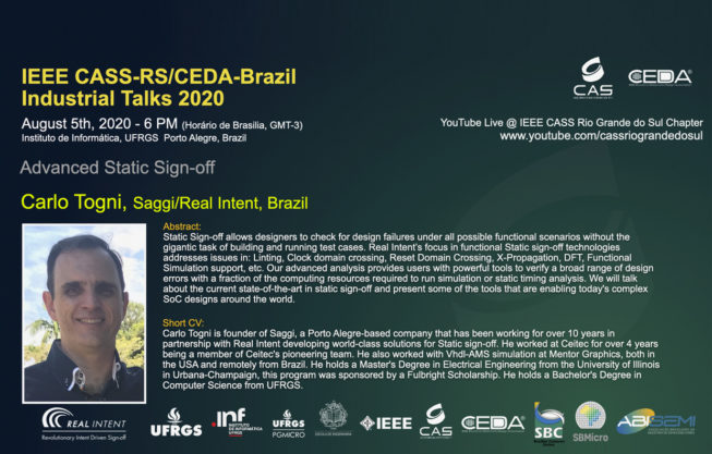Nesta quarta-feira, dia 05/08 às 18h (Horário de Brasília) ocorrerá a palestra “Advanced Static Sign-off”, com Carlo Togni (Saggi/Real Intent, Brasil)). A transmissão será feita pelo canal do YouTube do IEEE CASS Rio Grande do Sul Chapter.