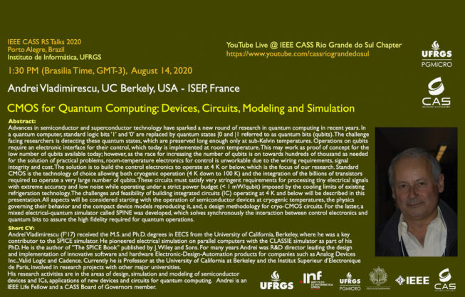 Nesta sexta-feira, dia 14/08 às 13h30min (Horário de Brasília) ocorrerá a palestra “CMOS for Quantum Computing: Devices, Circuits, Modeling and Simulation”, com Andrei Vladimirescu (UC Berkely, USA – ISEP, France). A transmissão será feita pelo canal do YouTube do IEEE CASS Rio Grande do Sul Chapter.