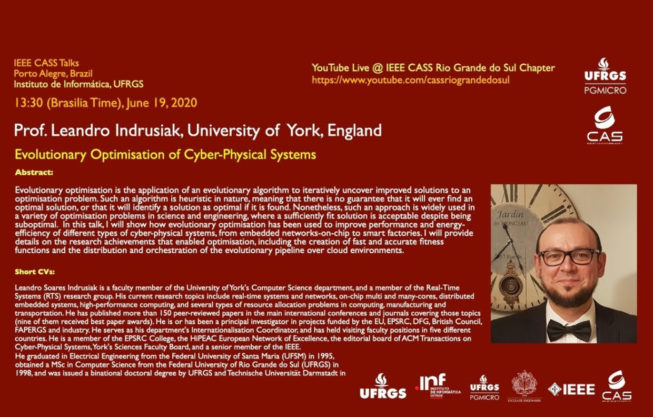 Nesta próxima sexta-feira, dia 19/06 às 13:30 (Horário de Brasília) ocorrerá a palestra “Evolutionary Optmisation of Cyber-Physical Systems”, com o Leandro Indrusiak (Universidade de York, Inglaterra, Reino Unido). A transmissão será feita pelo canal do YouTube do IEEE CASS Rio Grande do Sul Chapter (www.youtube.com/cassriograndedosul).