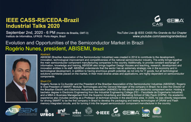 Nesta quarta-feira, dia 02/09 às 18h (Horário de Brasília) ocorrerá a palestra “Evolution and Opportunities of the Semiconductor Market in Brazil, com Rogério Nunes (Presidente da ABISEMI – Brasil). A transmissão será feita pelo canal do YouTube do IEEE CASS Rio Grande do Sul Chapter.