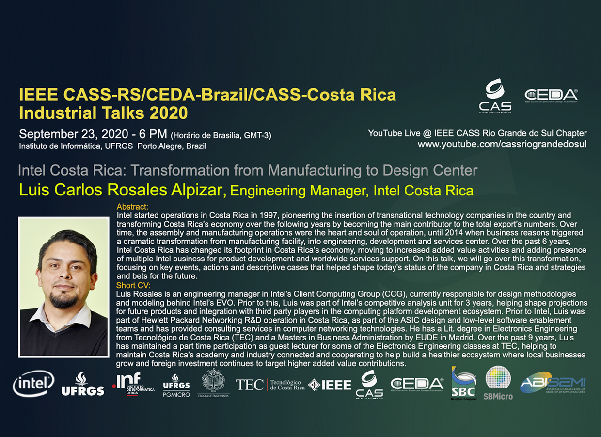 Nesta quarta-feira, dia 23/09 às 18h (Horário de Brasília) ocorrerá a palestra “Intel Costa Rica: Transformation from Manufacturing to Design Center”, com Luis Carlos Rosales Alpizar (Engineering Manager, Intel, Costa Rica).. A transmissão será feita pelo canal do YouTube do IEEE CASS Rio Grande do Sul Chapter.