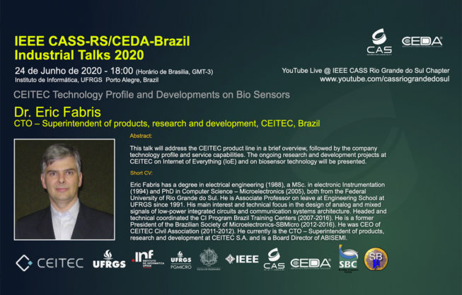 Nesta quarta-feira, dia 24/06 às 18h (Horário de Brasília) ocorrerá a palestra “CEITEC Technology Profile and Developments on Bio Sensors”, com o Dr. Eric Fabris (CTO – Superintendente de produtos, pesquisa e desenvolvimento, CEITEC, Brasil). A transmissão será feita pelo canal do YouTube do IEEE CASS Rio Grande do Sul Chapter (www.youtube.com/cassriograndedosul).