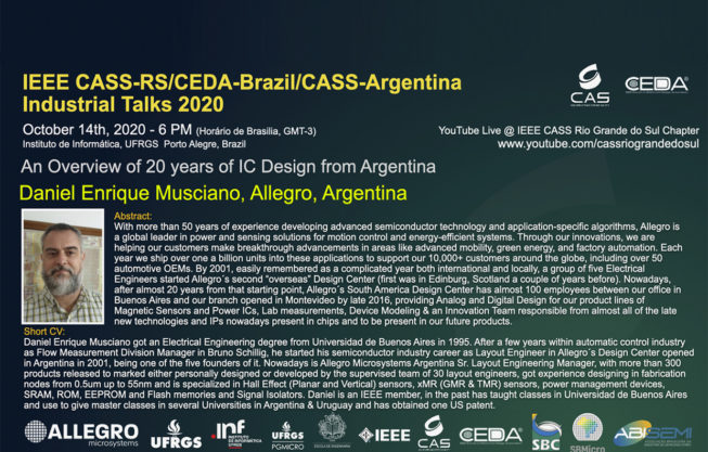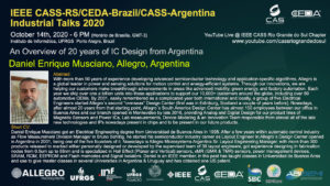 Nesta quarta-feira, dia 14/10 às 18h (Horário de Brasília) ocorrerá a palestra “An Overview of 20 years of IC Design from Argentina”, com Daniel Enrique Musciano (Allegro, Argentina). A transmissão será feita pelo canal do YouTube do IEEE CASS Rio Grande do Sul Chapter.