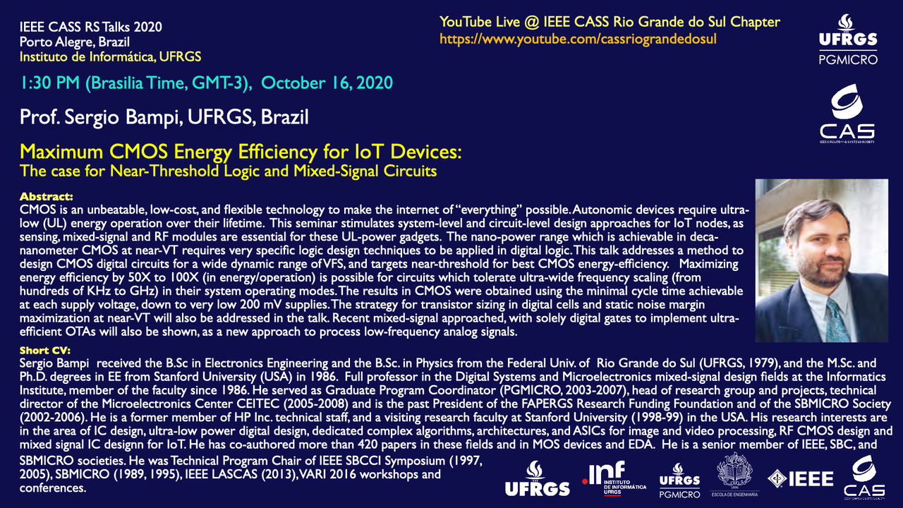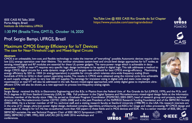 Nesta sexta-feira, dia 16/10 às 13h30min (Horário de Brasília) ocorrerá a palestra “Maximum CMOS Energy Efficiency for IoT Devices: The case for Near-Threshold Logic and Mixed-Signal Circuits” ministrada pelo Professor Sergio Bampi (UFRGS). A transmissão será feita pelo canal do YouTube do IEEE CASS Rio Grande do Sul Chapter.