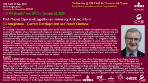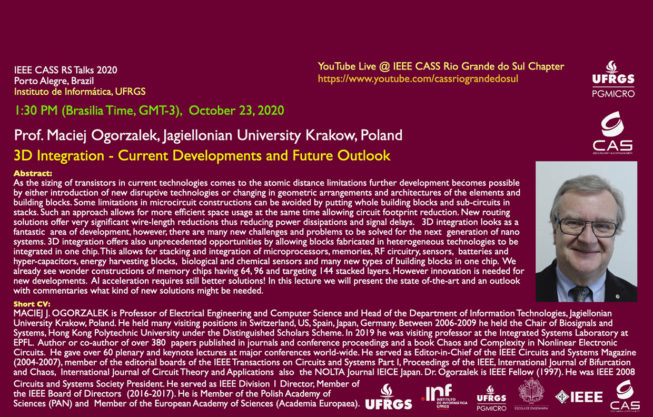Nesta sexta-feira, dia 23/10 às 13h30min (Horário de Brasília) ocorrerá a palestra “3D Integration – Current Developments and Future Outlook” ministrada pelo Professor Maciej Ogorzalek (Jagiellonian University Krakow Poland). A transmissão será feita pelo canal do YouTube do IEEE CASS Rio Grande do Sul Chapter.