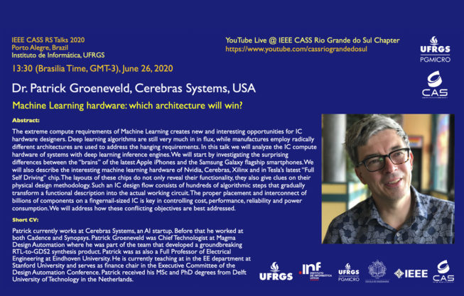 Nesta sexta-feira, dia 26/06 às 13h30min (Horário de Brasília) ocorrerá a palestra “Machine Learning hardware: wich architecture will win?”, com o Dr. Patrick Groeneveld, Cerebras Systems (USA). A transmissão será feita pelo canal do YouTube do IEEE CASS Rio Grande do Sul Chapter (www.youtube.com/cassriograndedosul).