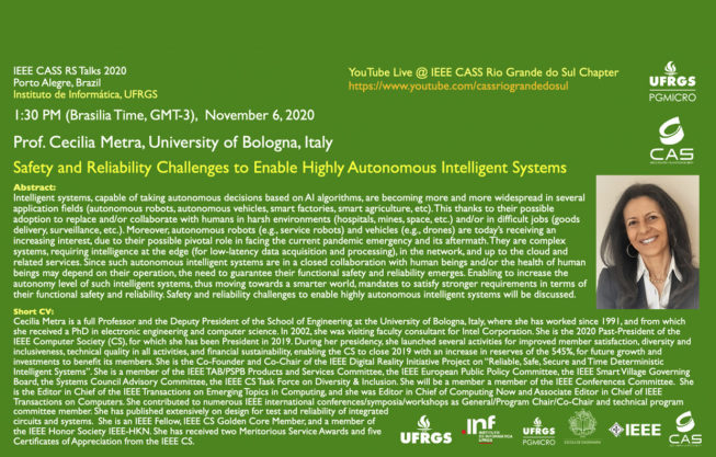 Nesta sexta-feira, dia 06/11 às 13h30min (Horário de Brasília) ocorrerá a palestra “Safety and Reliability Challenges to Enable Highly Autonomous Intelligent Systems” ministrada pela Profa. Cecilia Metra (University of Bologna, Italy). A transmissão será feita pelo canal do YouTube do IEEE CASS Rio Grande do Sul Chapter.