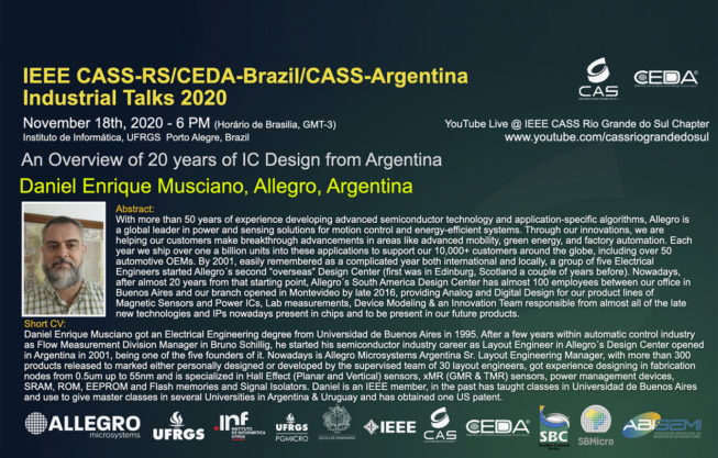 Nesta quarta-feira, dia 18/11 às 18h (Horário de Brasília) ocorrerá a palestra “An Overview of 20 Years of IC Design from Argentina”, com Daniel Enrique Musciano (Senior Layout Engineering Manager Argentina). A transmissão será feita pelo canal do YouTube do IEEE CASS Rio Grande do Sul Chapter.