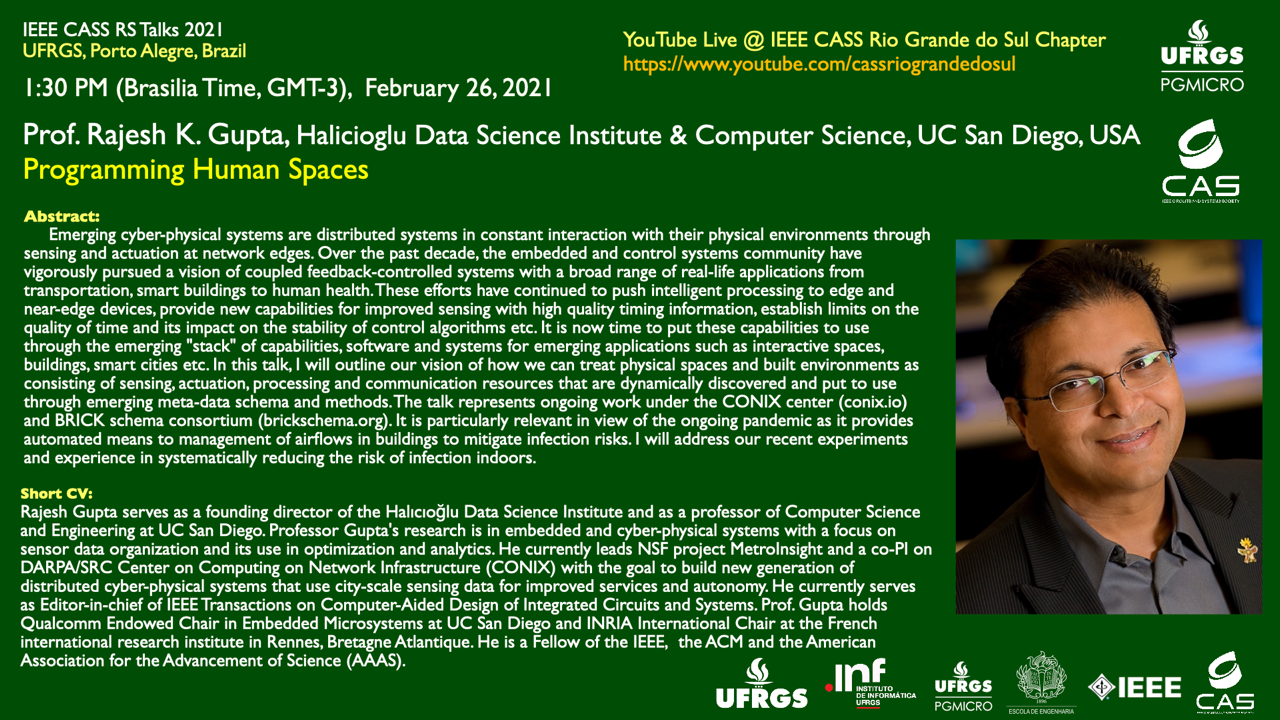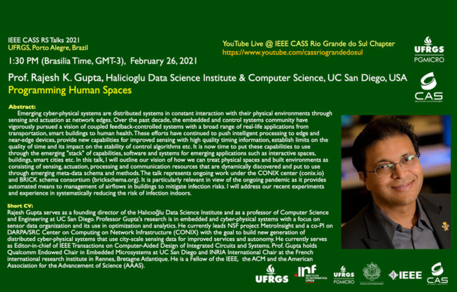 Nesta sexta-feira, dia 26/02 às 13h30min (Horário de Brasília) ocorrerá a palestra “Programming Human Spaces ” com o Prof. Rajesh K. Gupta, (Halicioglu Data Science Institute & Computer Science, UC San Diego, USA).