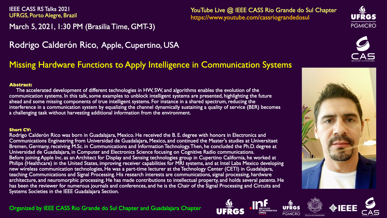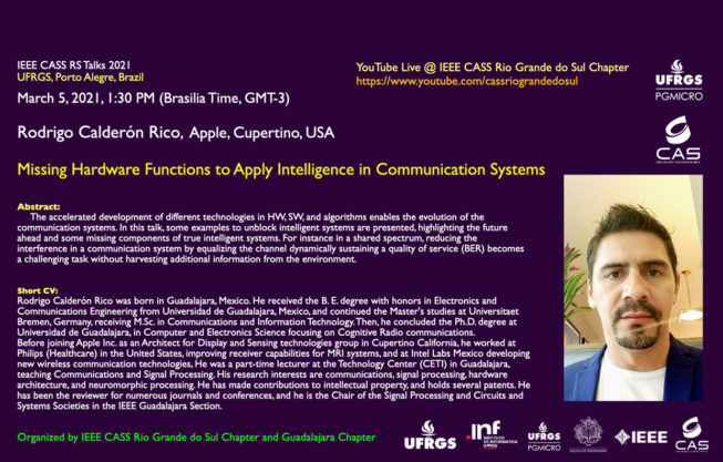 Nesta sexta-feira, dia 05/03 às 13h30min (Horário de Brasília) ocorrerá a palestra “Missing Hardware Functions to Apply Intelligence in Communication Systems” com Rodrigo Calderón Rico (Apple, Cupertino, USA).