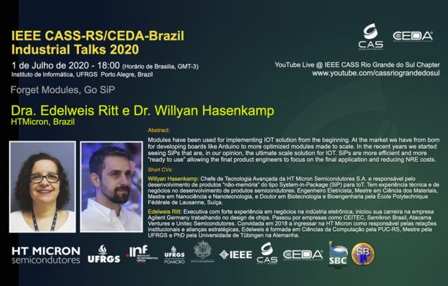 Amanhã, dia 01/07 às 18h (Horário de Brasília) ocorrerá a palestra “Forget Modules, Go SiP?”, com o Dr. Edelweis Ritt e o Dr. Willyan Hasenkamp (HTMicron, Brasil). A transmissão será feita pelo canal do YouTube do IEEE CASS Rio Grande do Sul Chapter (www.youtube.com/cassriograndedosul).