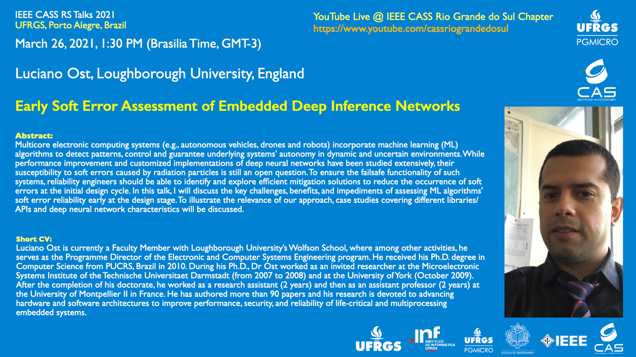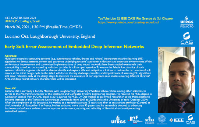 Na próxima sexta-feira, dia 26/03 às 16h15min (Horário de Brasília) ocorrerá a palestra “Early Soft Error Assessment of Embedded Deep Inference Networks” com o Prof. Luciano Ost (Loughborough University, England).