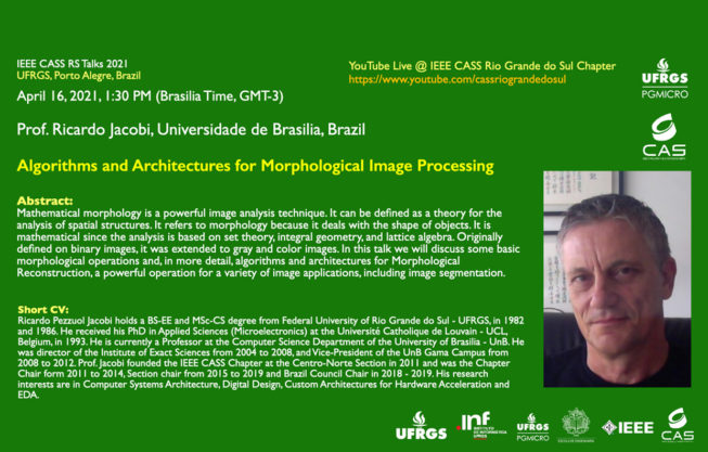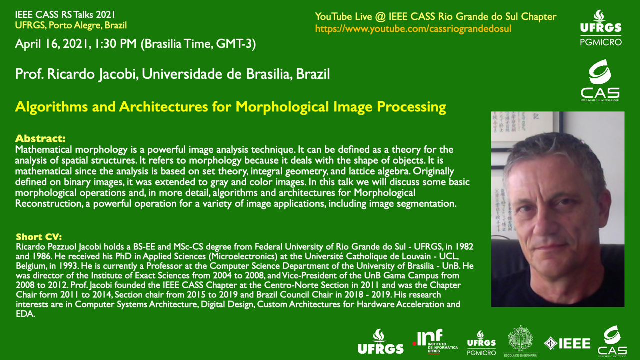 Na próxima sexta-feira, dia 16/04 às 13h30min (Horário de Brasília) ocorrerá a palestra “Algorithms and Architectures for Morphological Image Processing” com o Prof. Ricardo Jacobi, (Universidade de Brasília, Brasil).